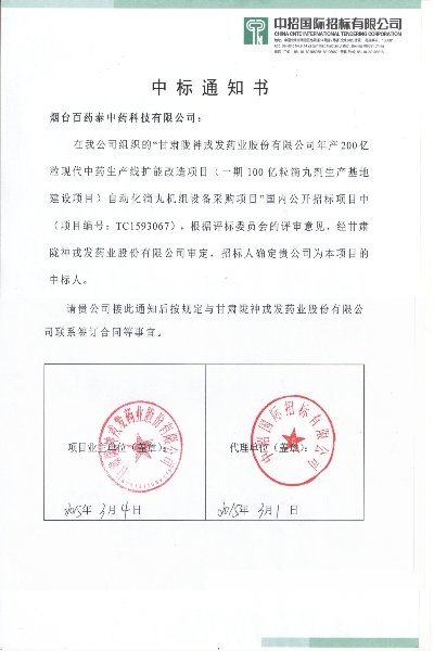 2015年2月12日,中招國(guó)際招標(biāo)有限公司受甘肅隴神戎發(fā)藥業(yè)股份有限公司委托,對(duì)年產(chǎn)200億粒滴丸劑生產(chǎn)線擴(kuò)能改造項(xiàng)目(一期100億粒滴丸劑生產(chǎn)基地建設(shè)項(xiàng)目)2條滴丸機(jī)生產(chǎn)線公開招標(biāo),我司中標(biāo)。據(jù)悉,2014年隴神戎發(fā)藥業(yè)元胡止痛滴丸銷售額3.1億元, 是國(guó)內(nèi)單一滴丸品種年銷售過億元的3個(gè)品種之一。